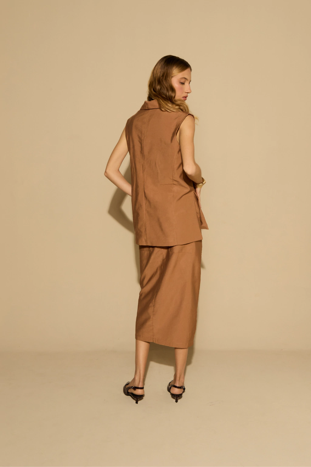 descrição: Colete balanço tem modelagem reta, comprimento na altura do quadril e possui forro de algodão na cor creme. A criação tem fechamento por três botões centrais, sobrepostos pela gola com curvas assimétricas, um elemento de estilo muito usado nas nossas criações. A criação dialoga perfeitamente com a saia balanço.