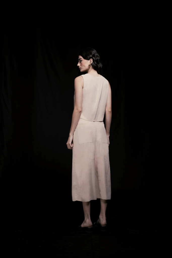 Colete de comprimento intermediário com abotoamento na frente, recortes que acomodam o busto e bordados manuais com figuras importantes dos brincantes do reisado: mateu, boi e jaraguá. A peça foi produzida dos tamanhos 36 ao 44 com tecido de toque leve.