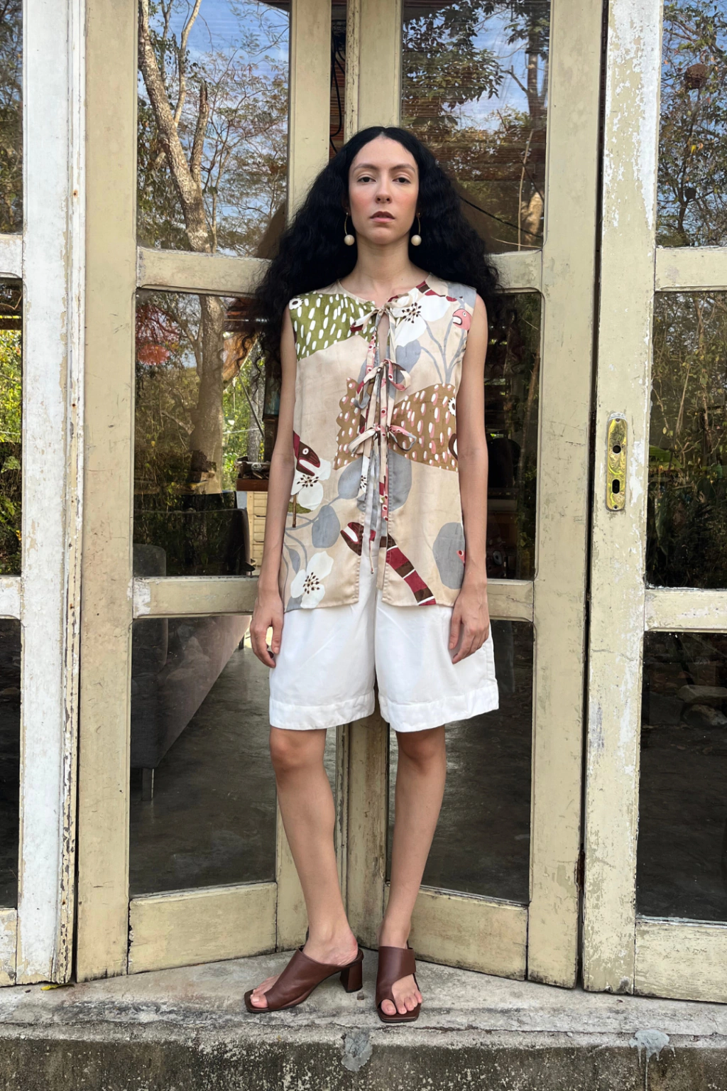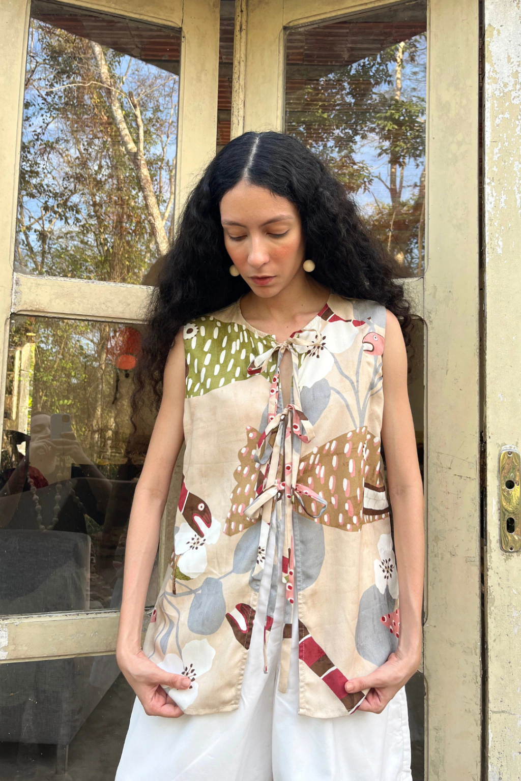 Design: Colete Garfanhoto apresenta modelagem reta, comprimento intermediário e amarração frontal, dando maior versatilidade à peça, que tem caimento solto graças ao tecido leve. Uma peça ideal para composições descontraídas, podendo compor com a calça cobra, de mesma estampa, ou com bottons de cores complementares ou similares à estampa.
