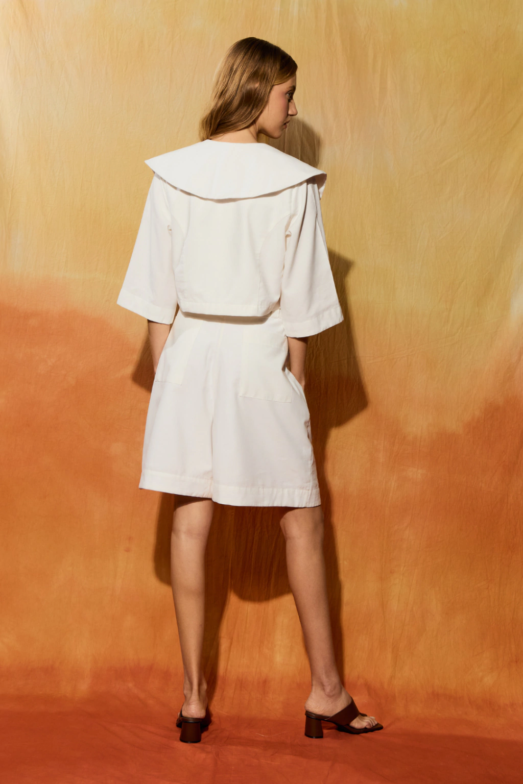descrição: Short interior apresenta duas pregas frontais, fechamento por botão e colchete interno e não apresenta cós, trazendo um visual limpo e elegante à criação. Apresenta passantes, bolsos laterais invisíveis e bolsos trazeiros. Nas costas existe uma pala que modela a silhueta, tornando a modelagem muito bem desenvolida e clássica. Apresenta um forro de mesmo tom do tecido principal. apresenta costura francesa em toda sua extensão e na união com o forro apresenta acabamento embutido