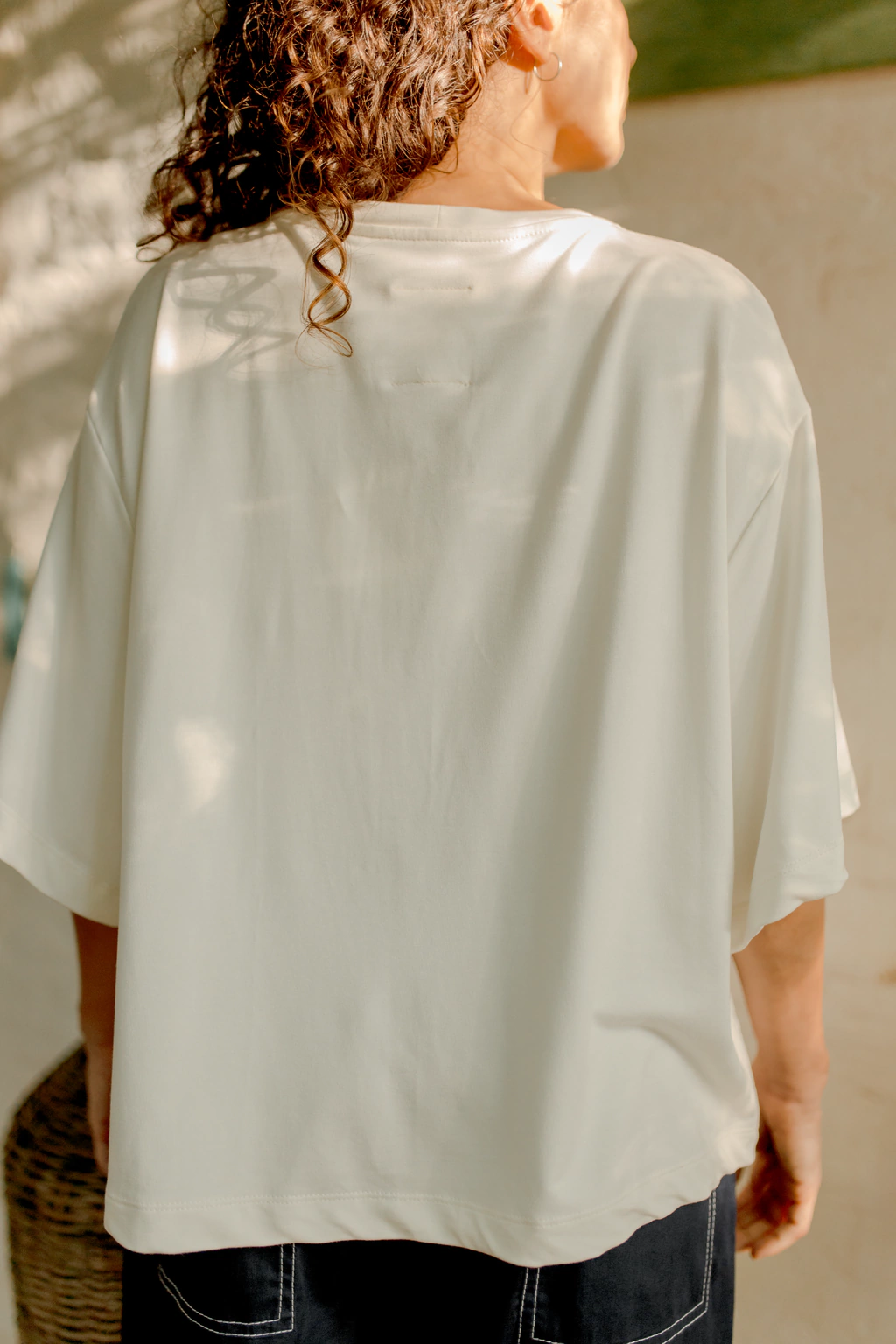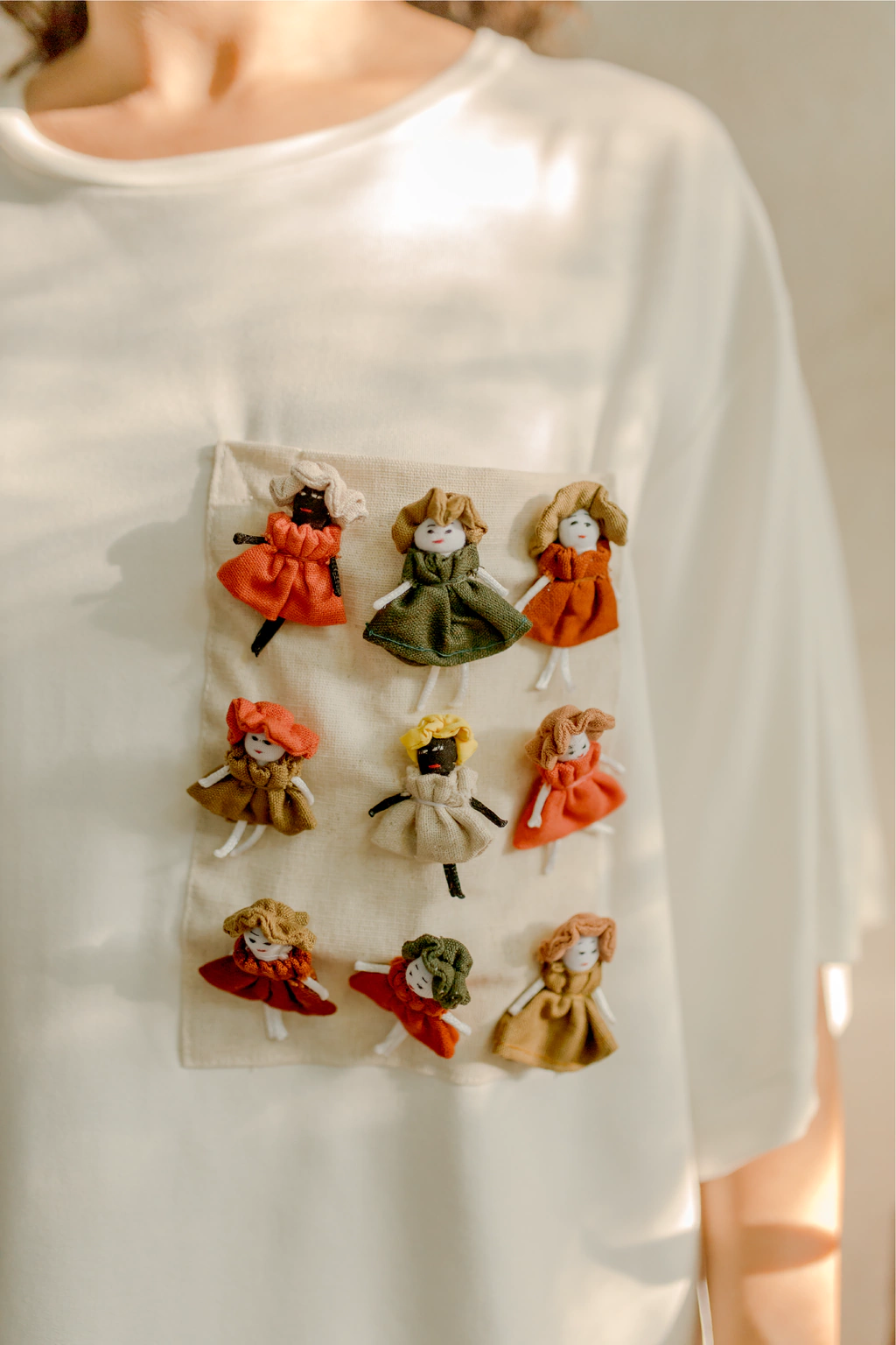 Camisa as meninas foi feita em tamanho único, em malha, com modelagem tamanho único e ampla. A grande força da peça está no seu bolso, feito em linho com aplicações de mini bonecas de pano. As bonecas foram feitas com tecidos que seriam descartados da nossa coleção, produzidas pelo Associação das Bonequeiras do Pé de manga no Crato, região do Cariri Cearense.