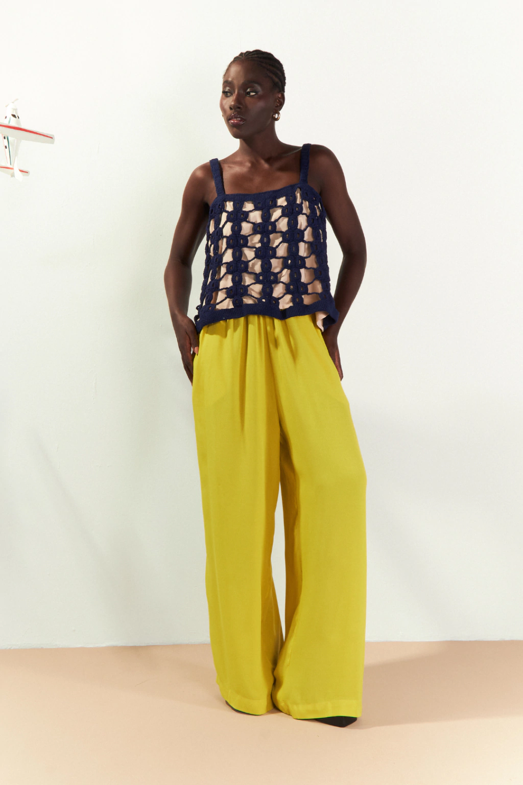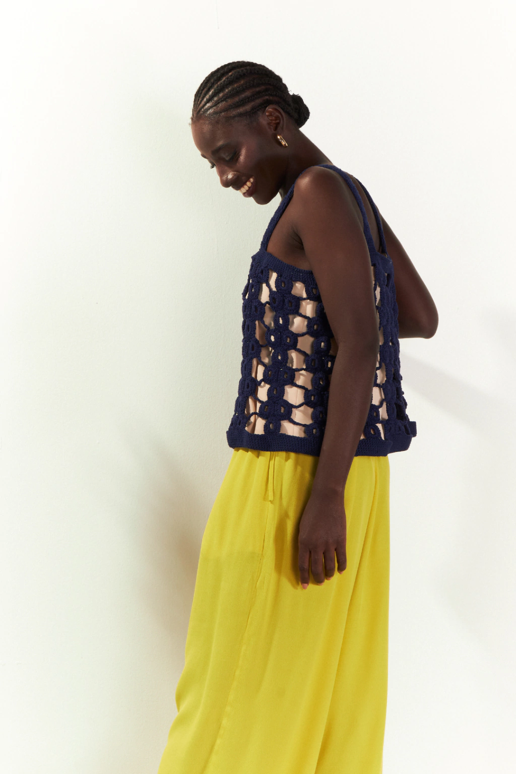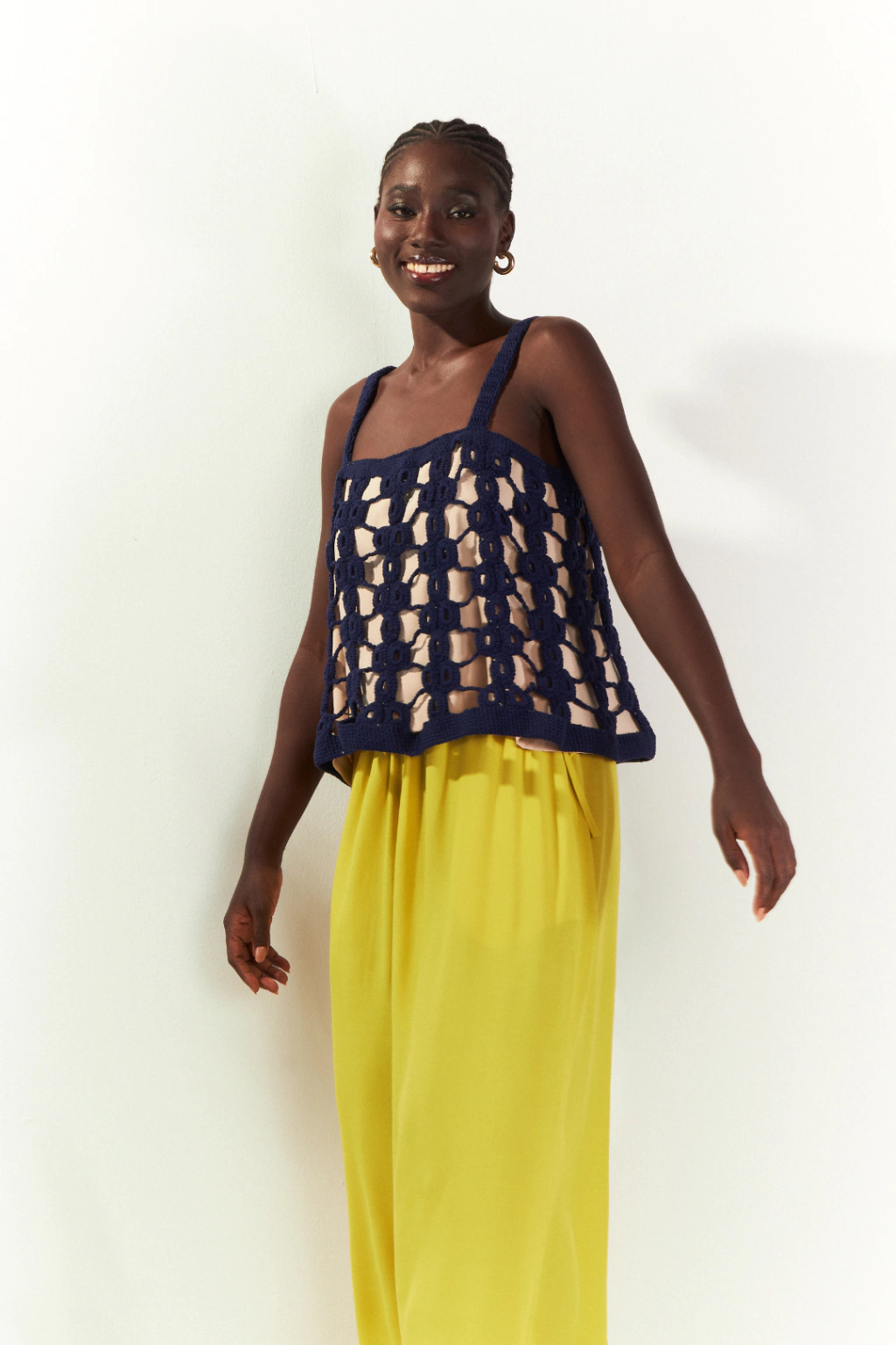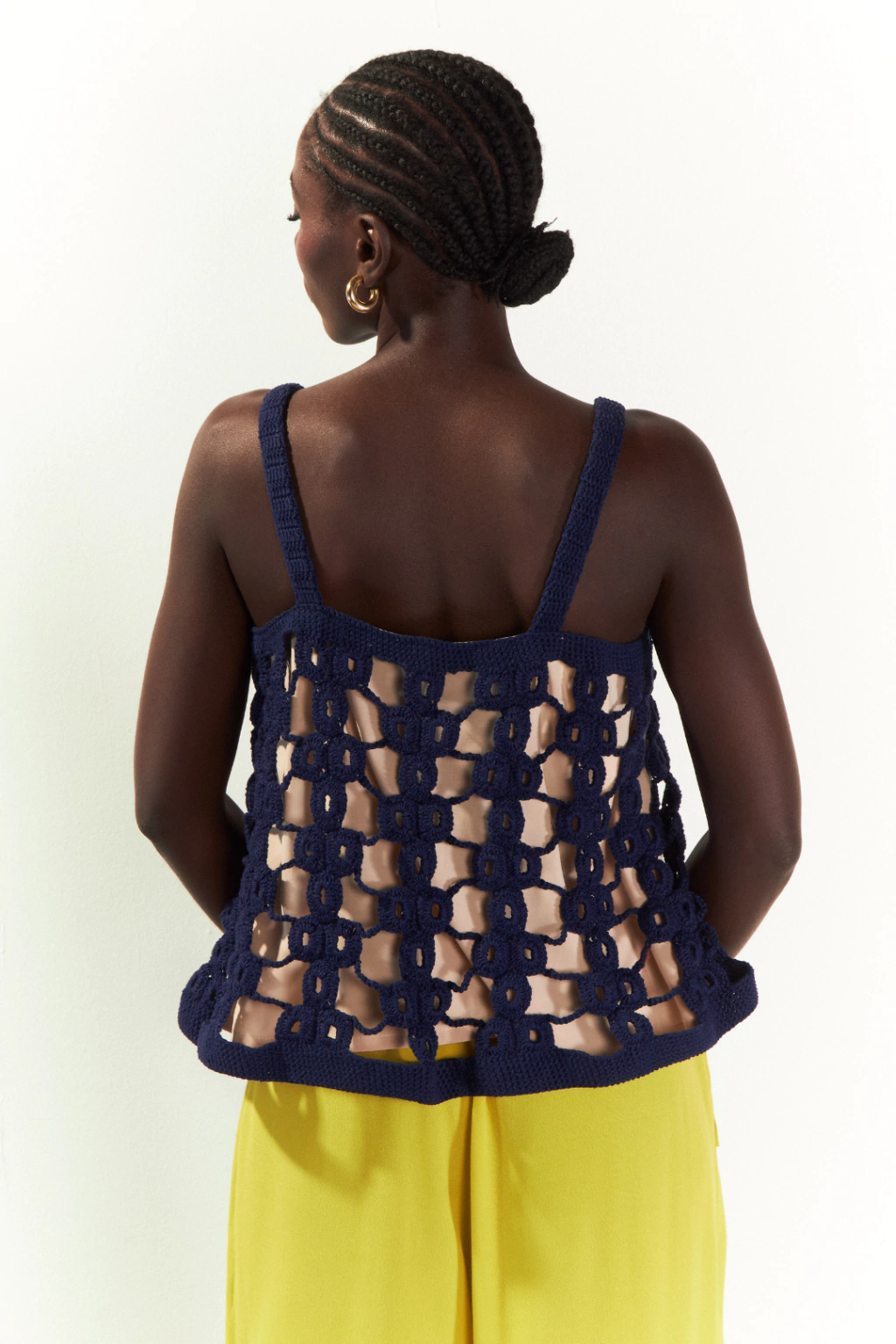 Blusa Amarelinha é feito sob encomenda em crochê na cor azul marinho, seu desenho faz referência à brincadeira infantil amarelinha. Sua modelagem é em formato evasê, apresenta alças e um forro em cor creme.