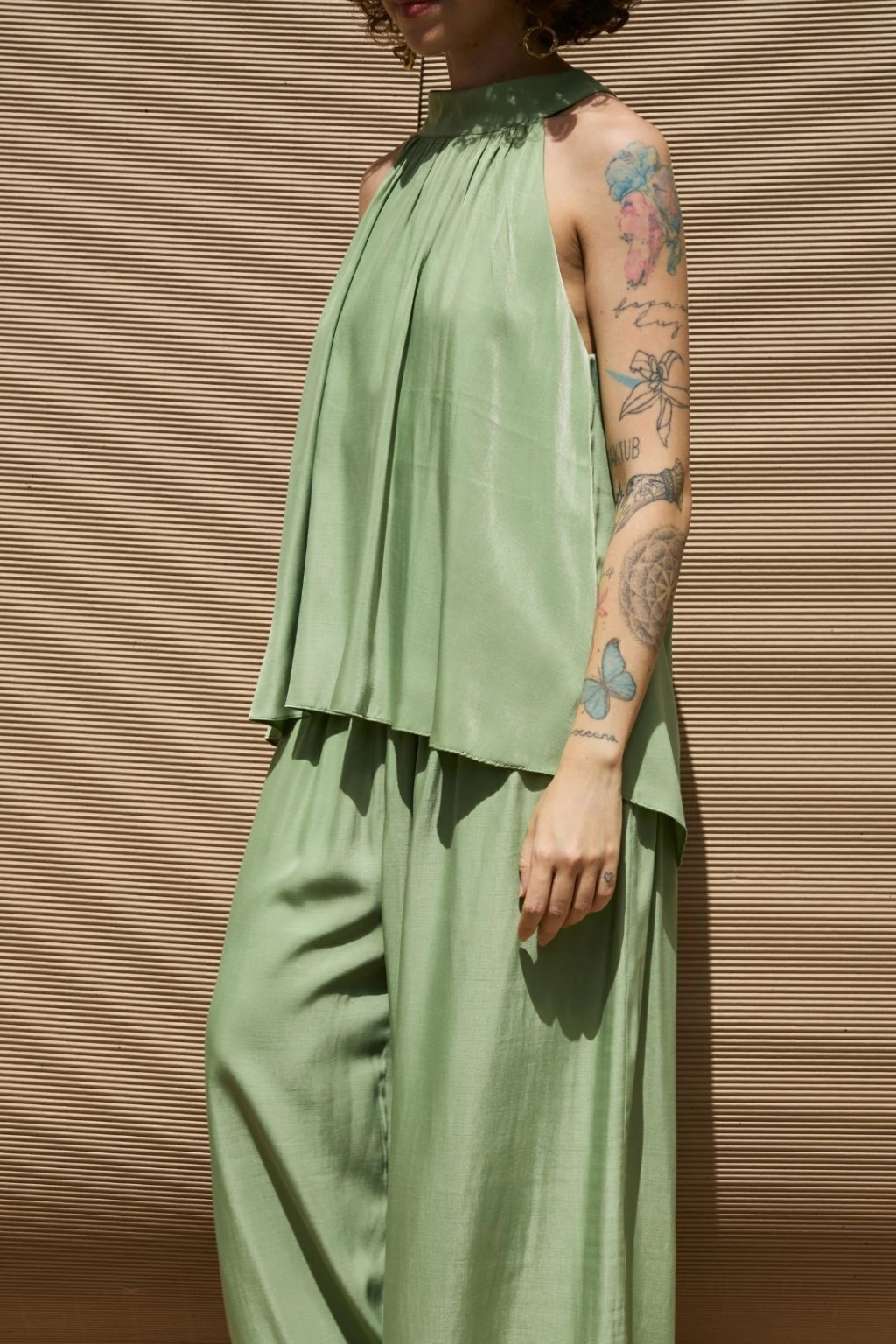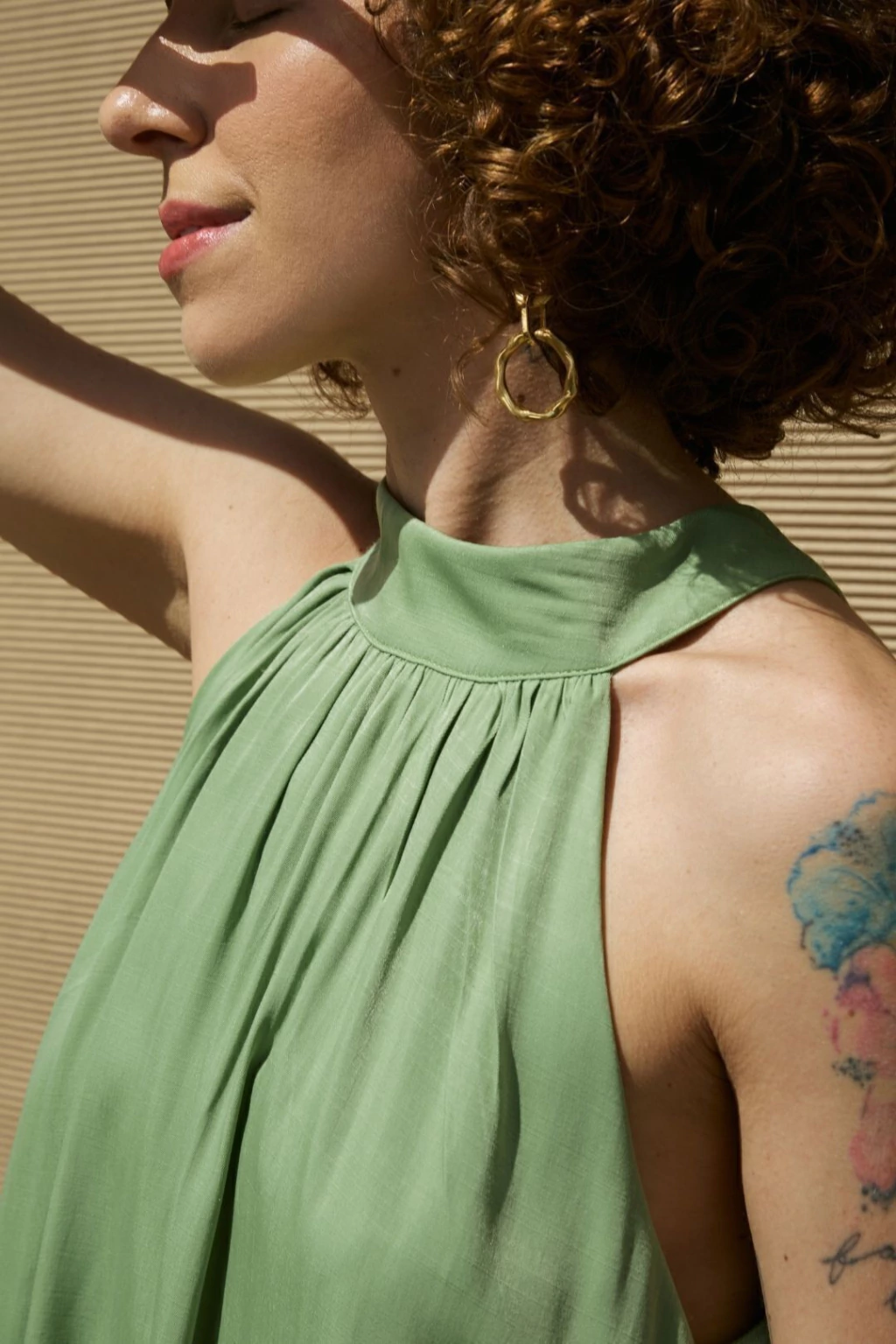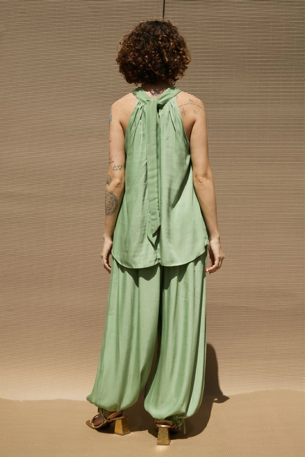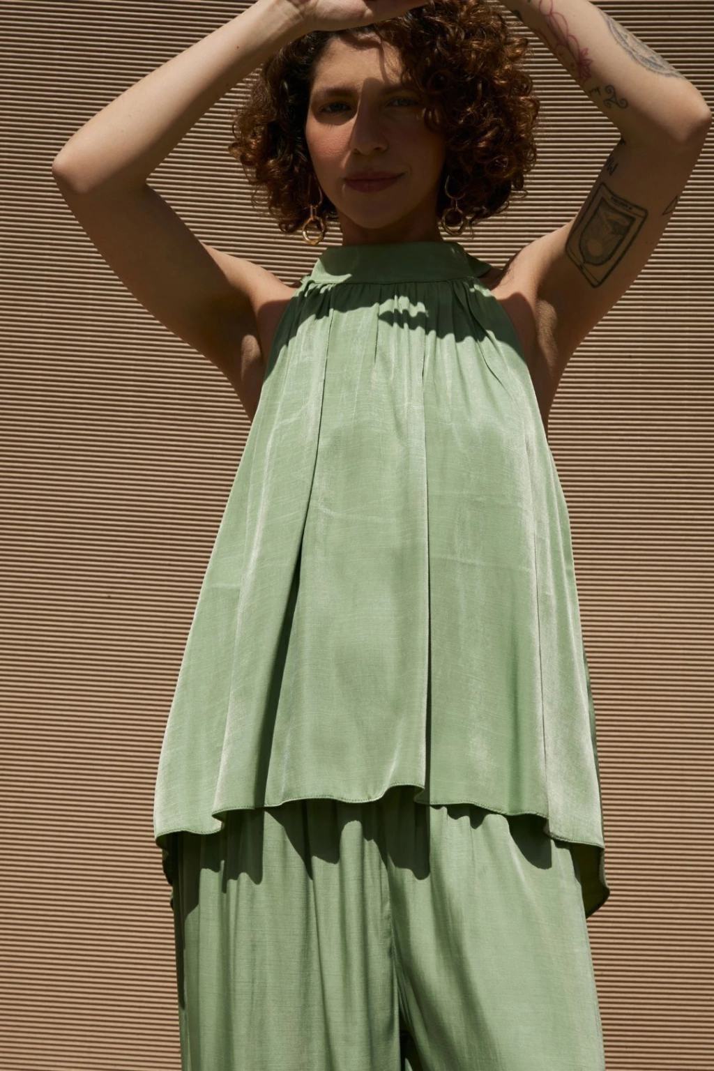 design: Blusa Bruma foi desenvolvida com tecido de toque leve e modelagem ampla, apresenta abertura nas costas, onde se encontra a amarração da peças. A frente apresenta gola que pousa no pescoço e recebe franzido no decote, o que traz ume efeito especial à criação. Sua cava é estilo regata, o que confere maior conforto à peça.