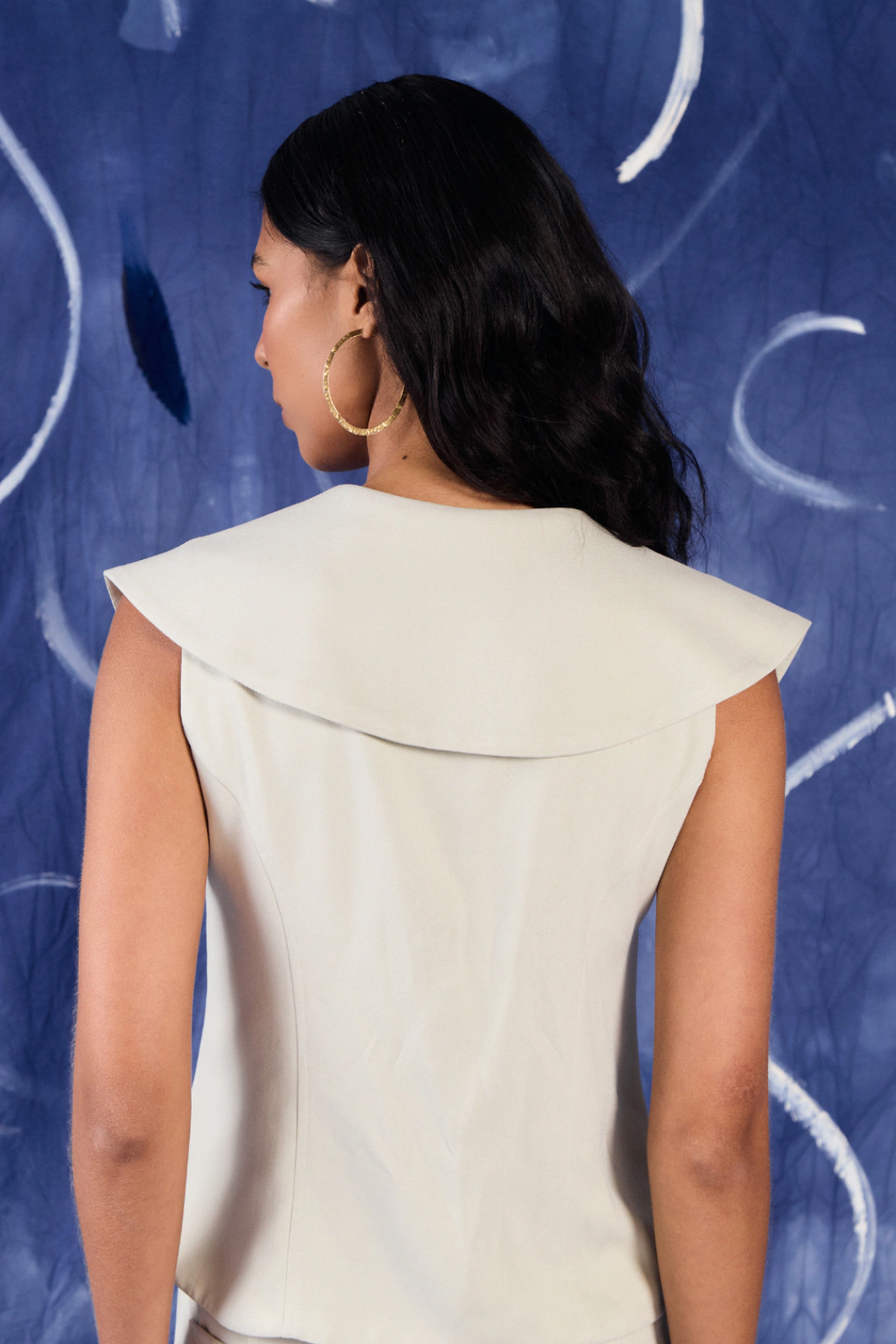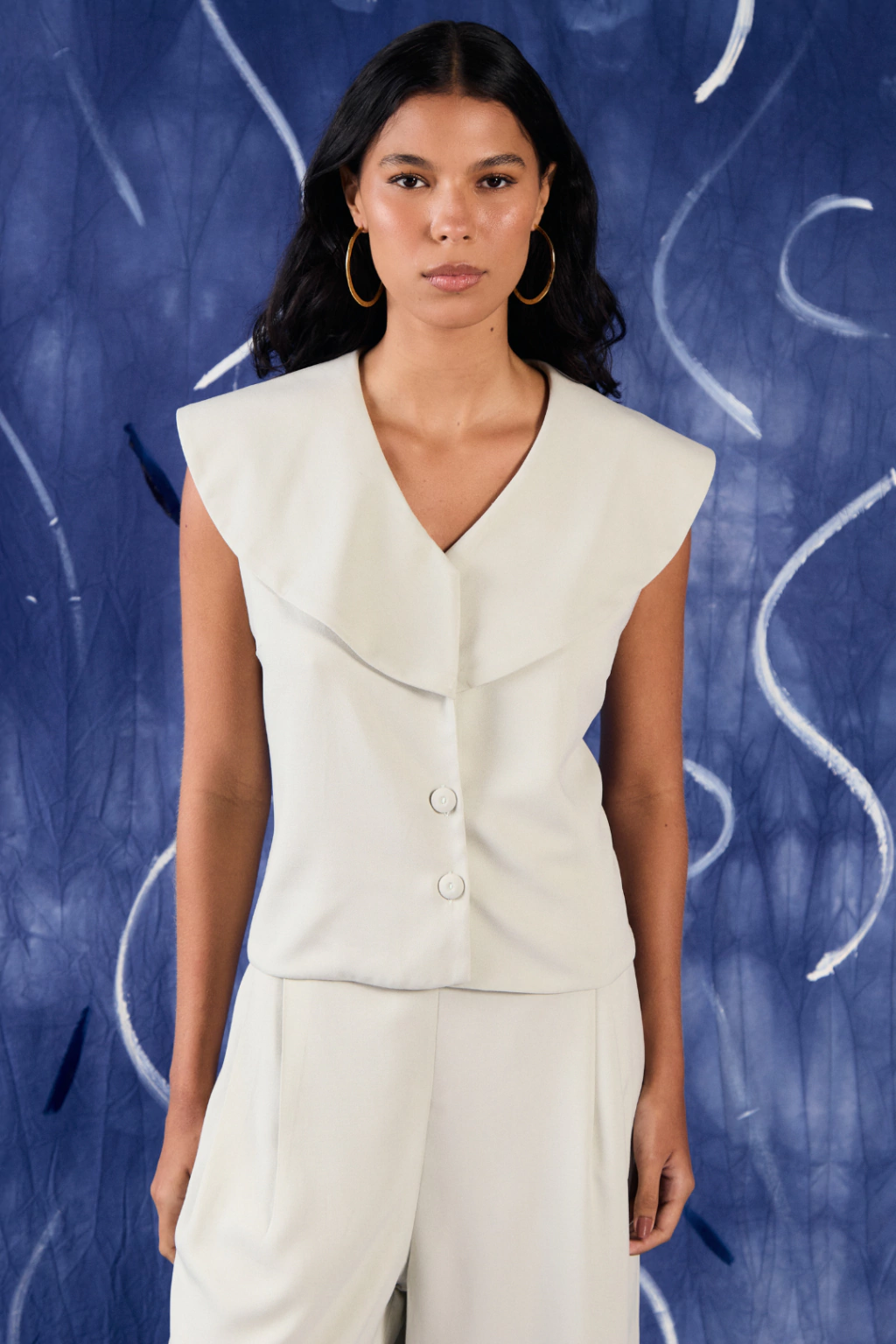 descrição: Blusa d'água apresenta comprimento intermediário, pences no busto e fechamento frontal por abotoamento. A peça apresenta modelagem que modela suavemente a silhueta, sem perder o conforto, e carrega como força maior a gola farta. A gola recebe um broche esculpido em madeira no Juazeiro do Norte. O broche faz referência à morfologia do alface d'água, planta muito encontrada nos açude e águas paradas e acompanha a peça.