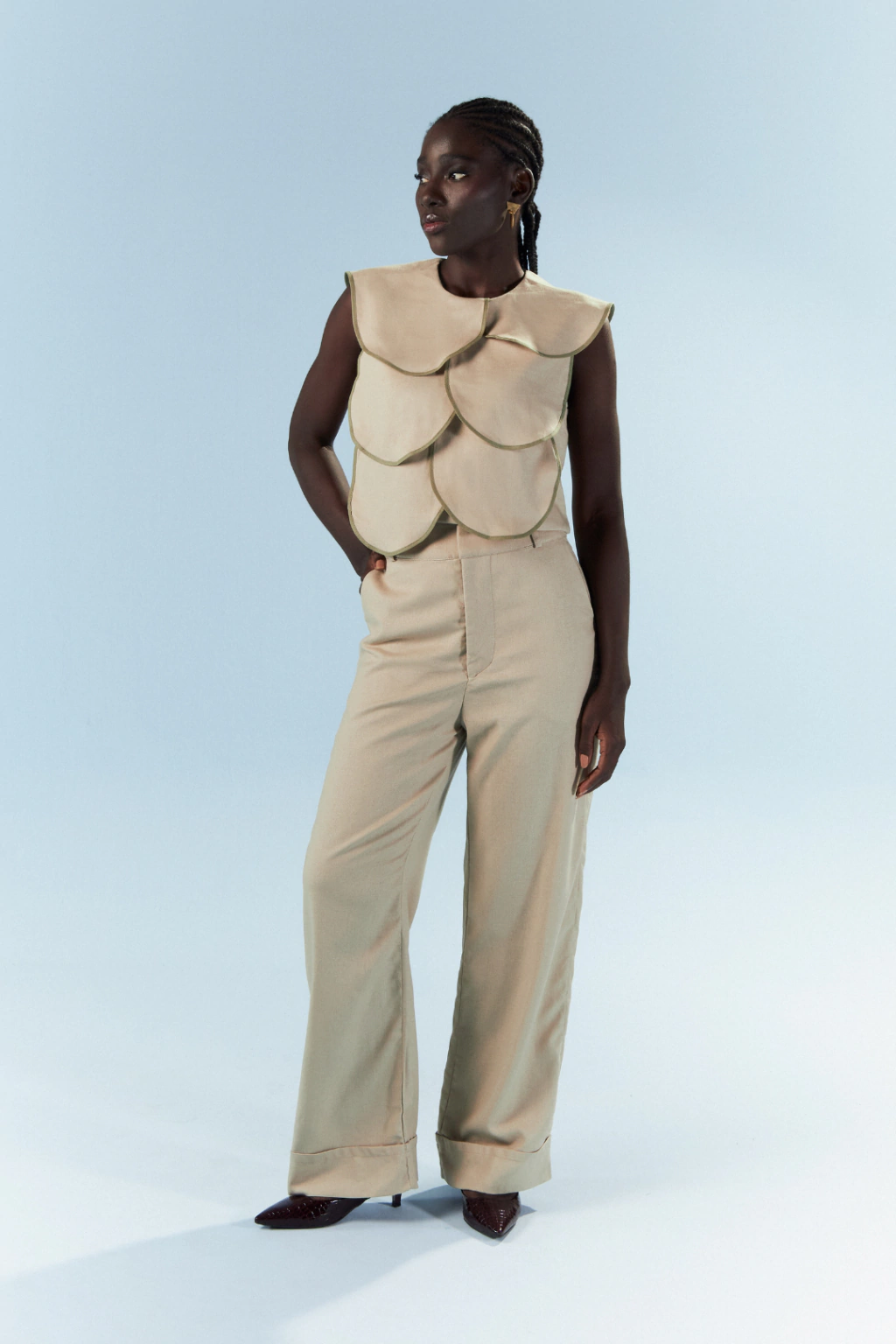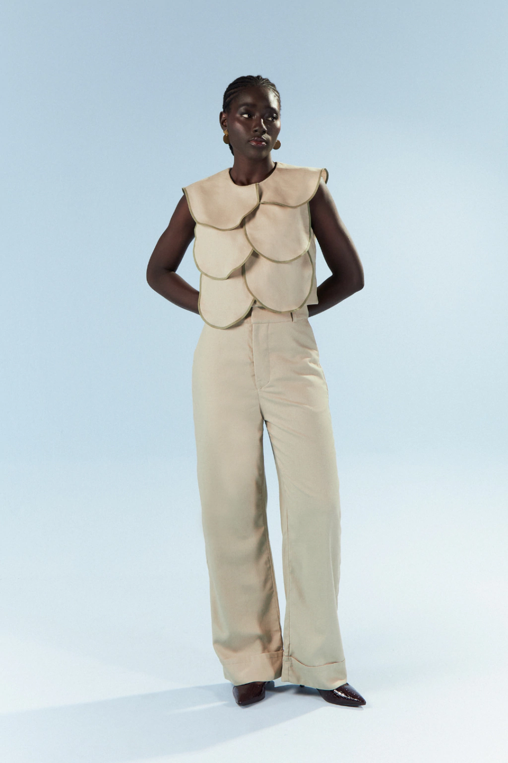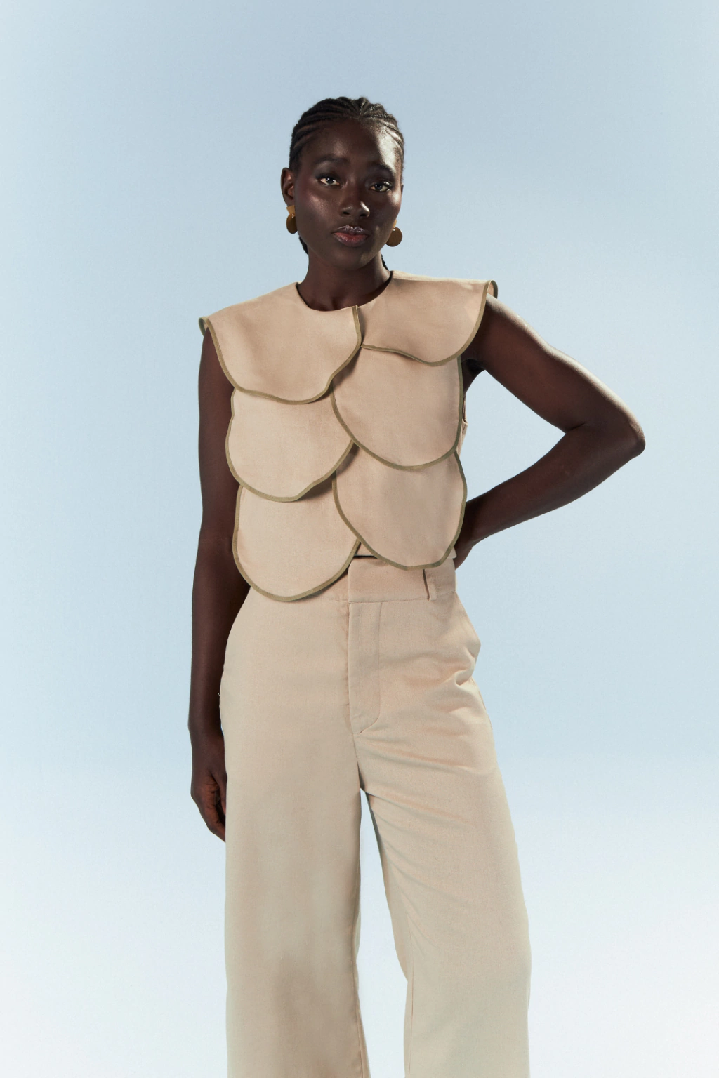 A blusa faz alusão ao cactáceo palma e tem pétalas que remetem às formas ovoides do cacto. A peça em linho misto apresenta formas que saem da silhueta e se destacam por viés de cor contrastante. A peça foi criada na primeira coleção da Açude e volta como clássico com cores novas. Seu fechamento acontece nas costas por botão coberto com o próprio tecido.