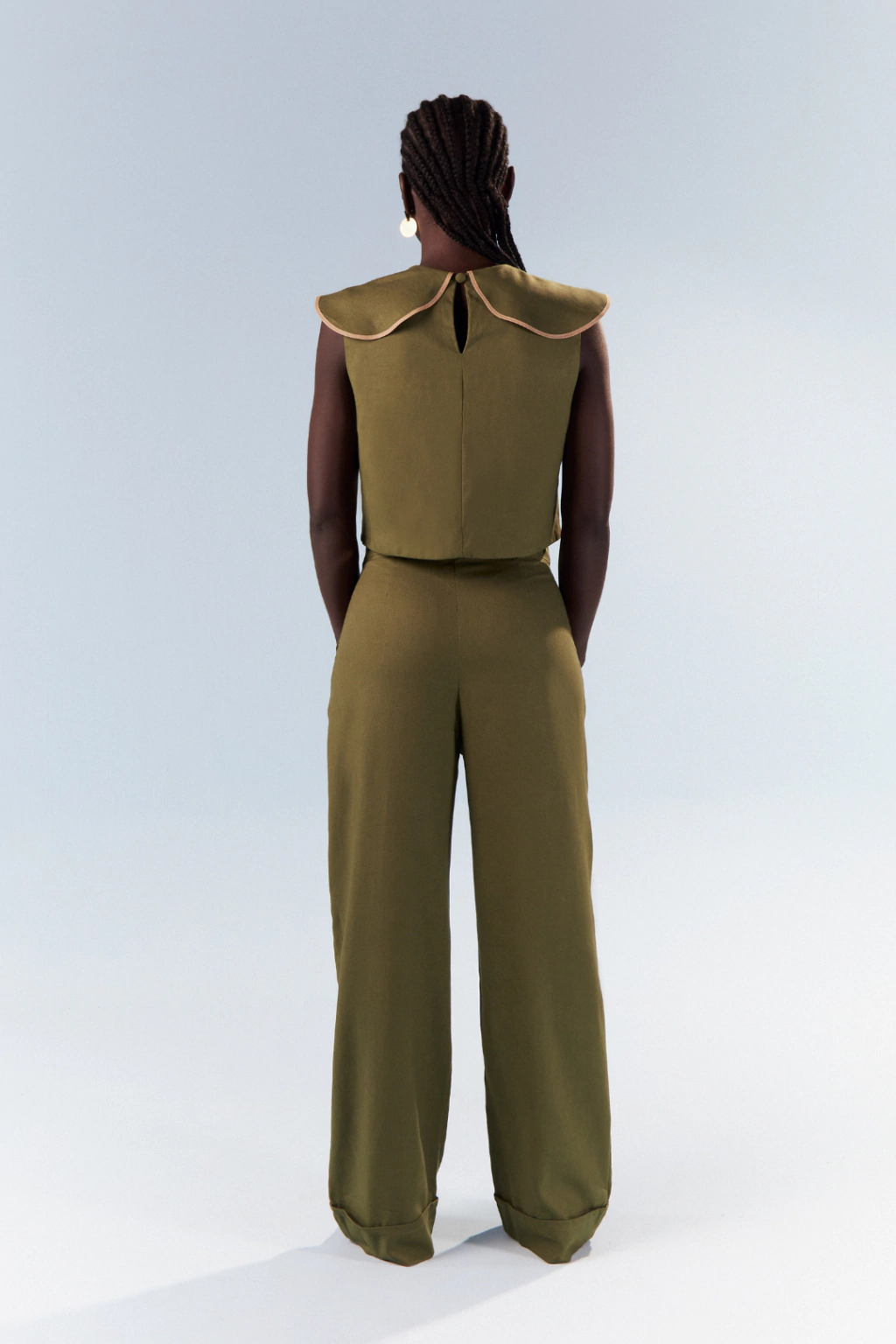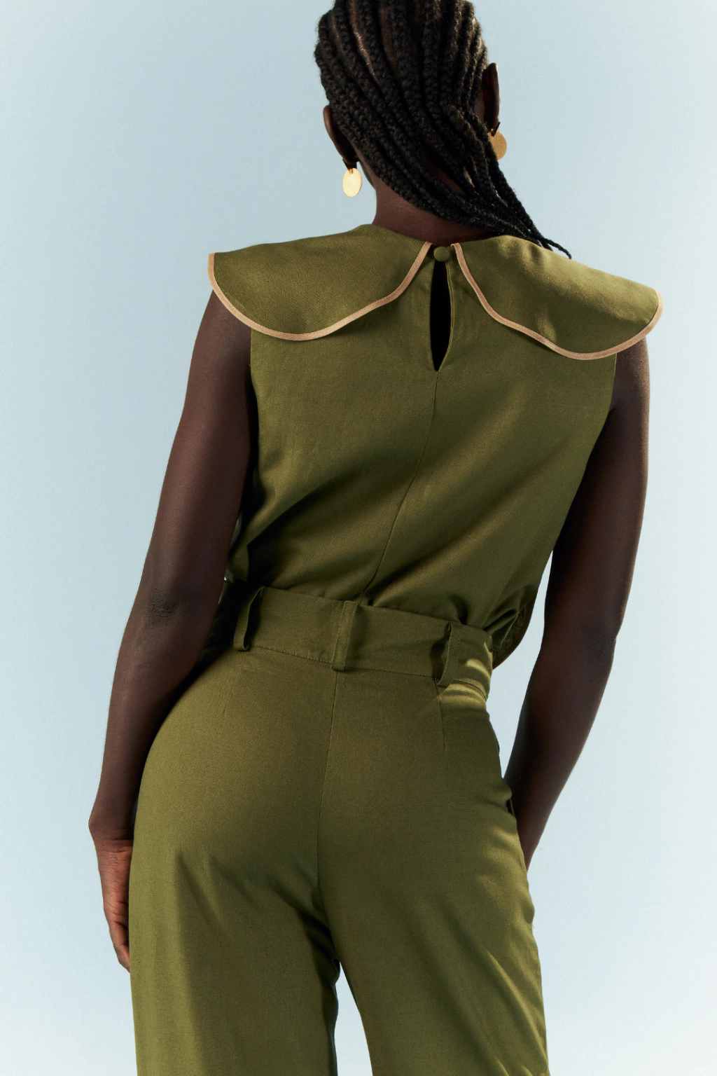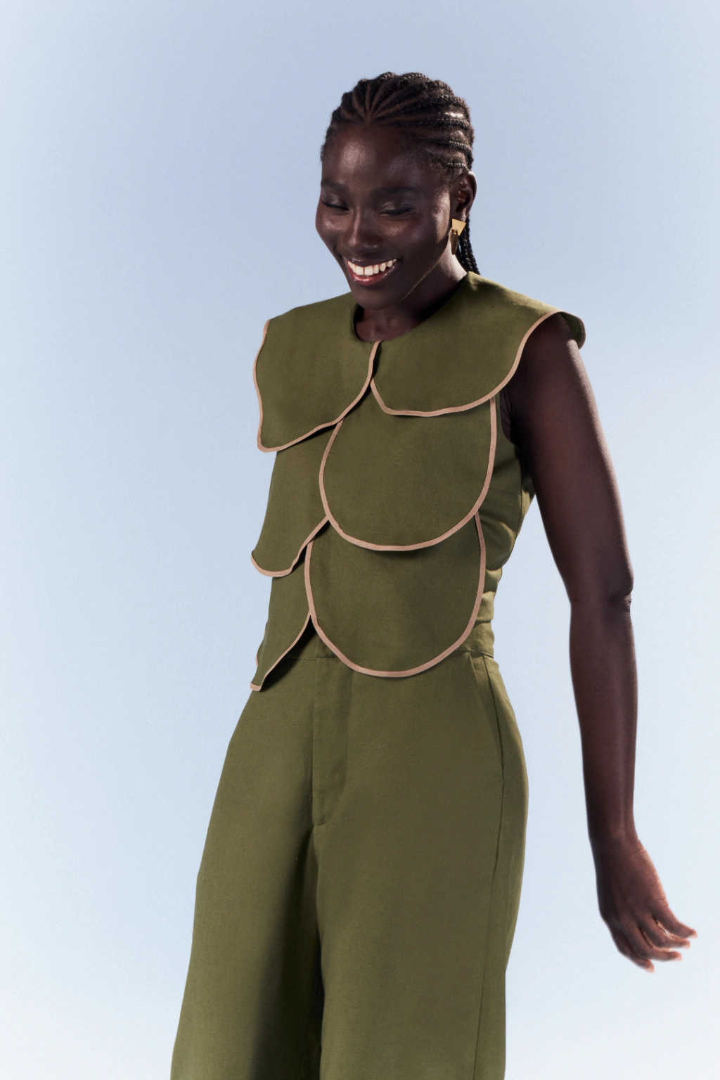 A blusa faz alusão ao cactáceo palma e tem pétalas que remetem às formas ovoides do cacto. A peça em linho misto apresenta formas que saem da silhueta e se destacam por viés de cor contrastante. A peça foi criada na primeira coleção da Açude e volta como clássico com cores novas. Seu fechamento acontece nas costas por botão coberto com o próprio tecido.