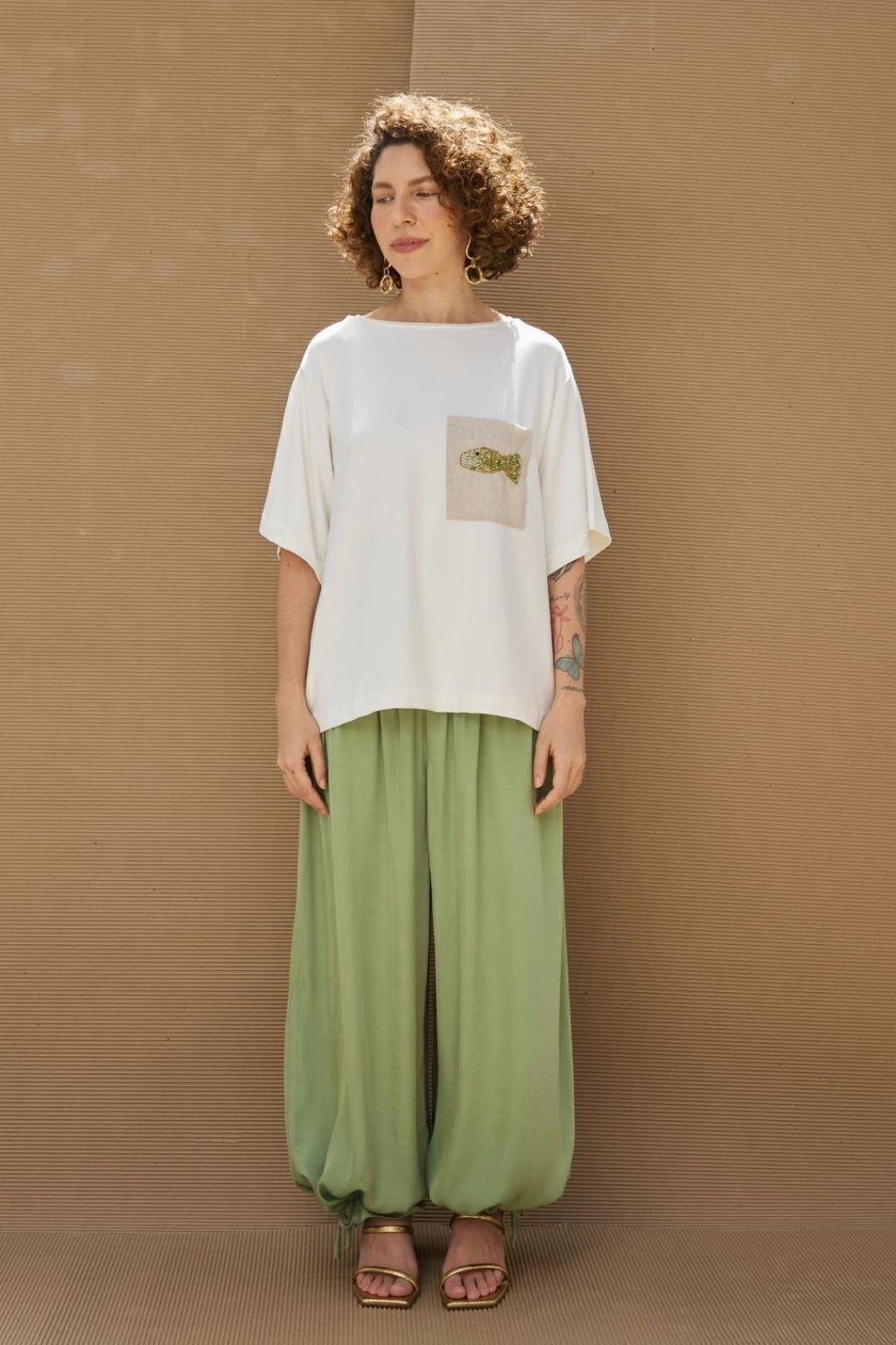 Design: Camiseta peixe foi desenvolvida na cor off, apresenta mangas, feita em malha e gola de memso tecido. A grande força da peça está no seu bolso em linho, onde foi bordado um peixe com canutilhos e miçangas de vidro, fazendo referência ao trabalho do mestre Francisco Graciano.