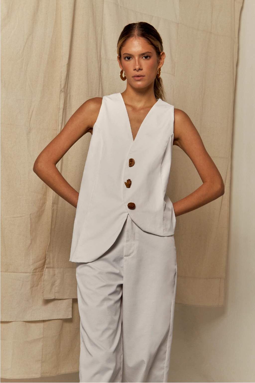 Colete ex-voto é uma peça assimétrica, fabricado em tecido com leve brilho e estruturado, com modelagem ampla. A peça carrega sua maior força nos botões em madeira, esculpidos à mão em Juazeiro do Norte pelo querido artesão Racar(em memória). Os botões fazem referência aos ex-votos, símbolos de fé no Cariri Cearense. Aqui temos a forma de uma orelha, mão e olho.