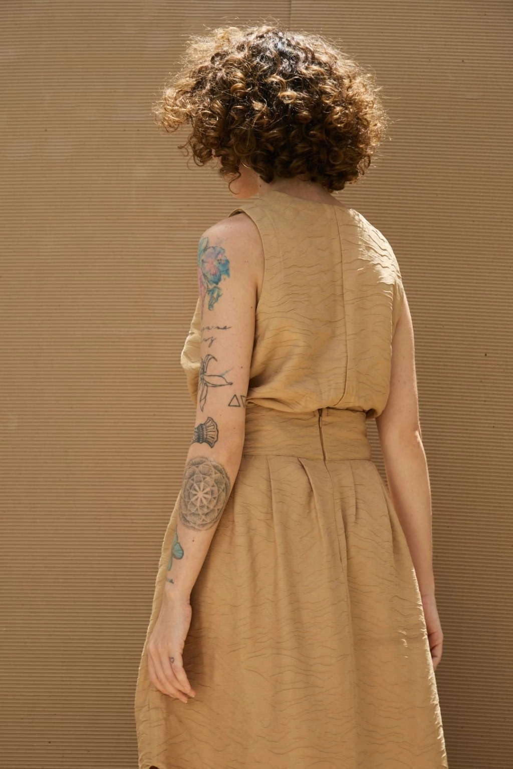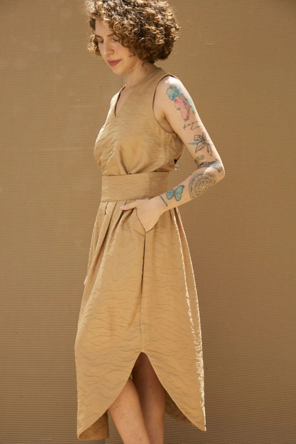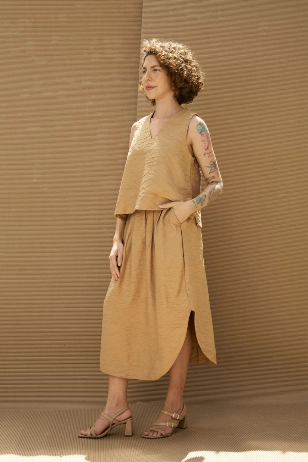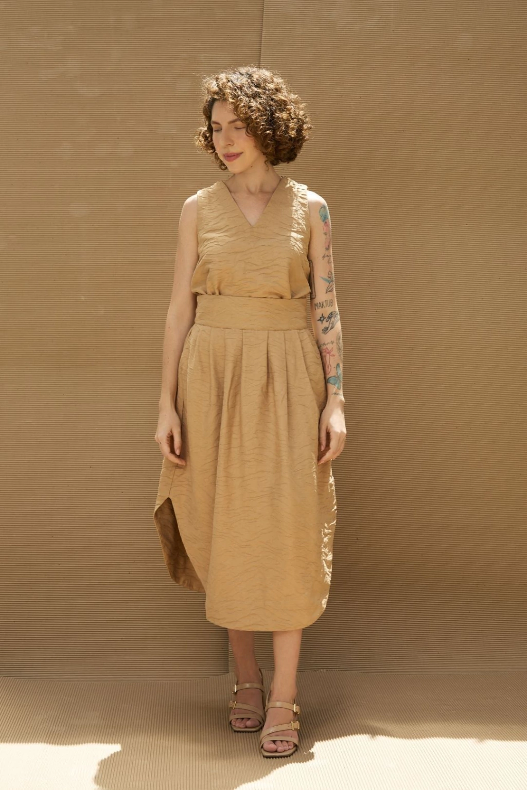 design: Saia barragem apresenta modelage com pregas no cós, bolsos laterais para uma melhor funcionamidade da peça e fechamento por zíper invisível nas costas. Suas fendas apresentam forma ondulada, o que confere um desenho especial à criação, deixando a peça mais fluida e leve.