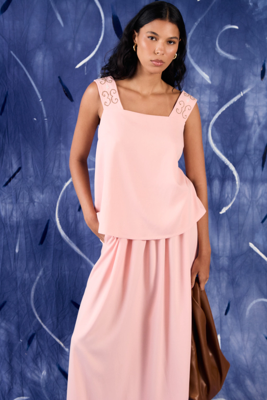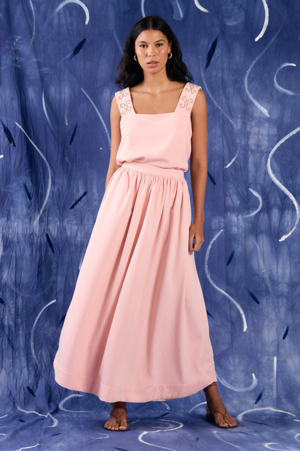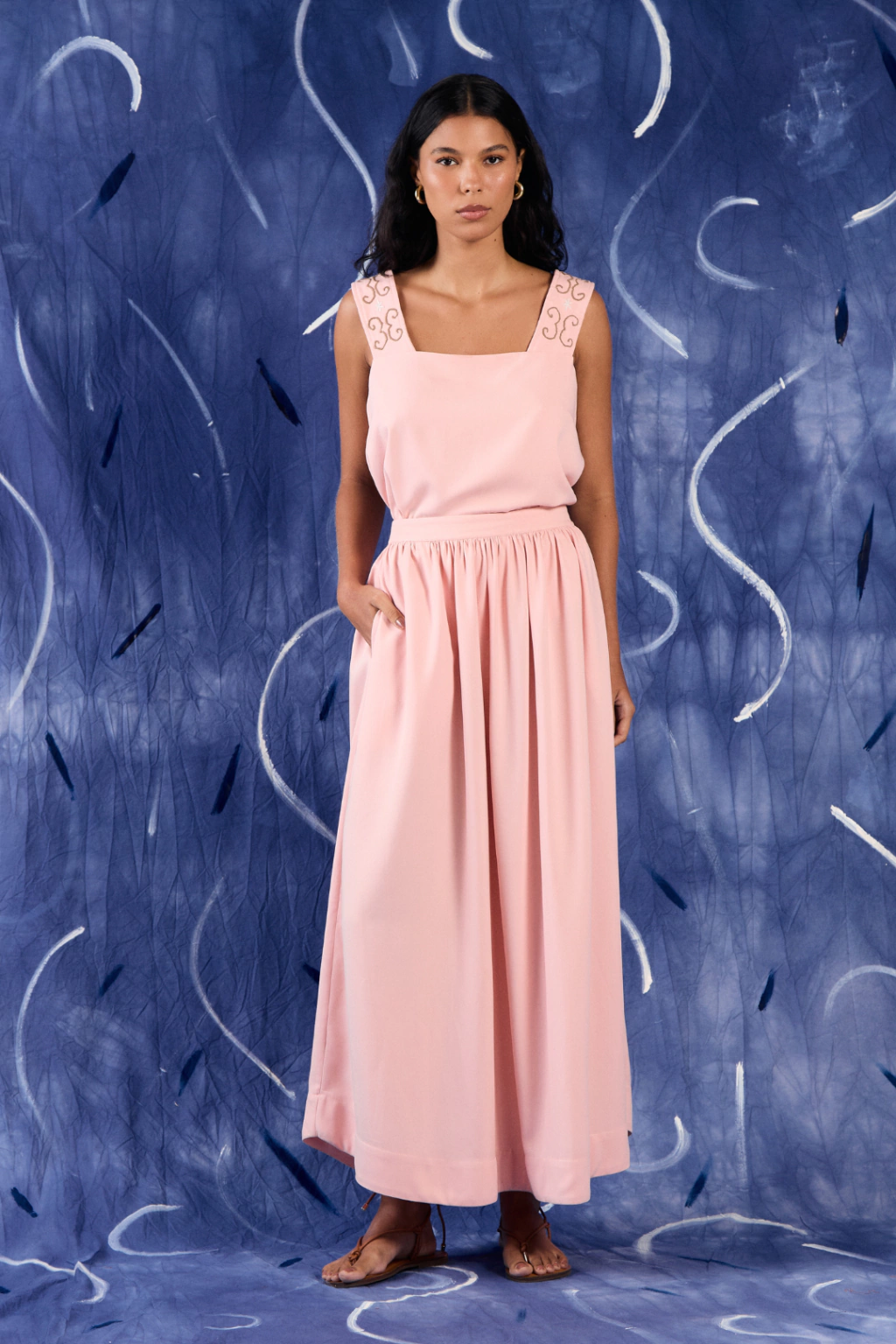 descrição: Saia Beira apresenta modelagem ampla com franzido em toda sua circunferência, carrega um cós duplo e bolsos laterais para uma melhor praticidade e funcionalidade da peça. Sua barra apresenta detalhes ondulados na lateral e seu comprimento é longo.