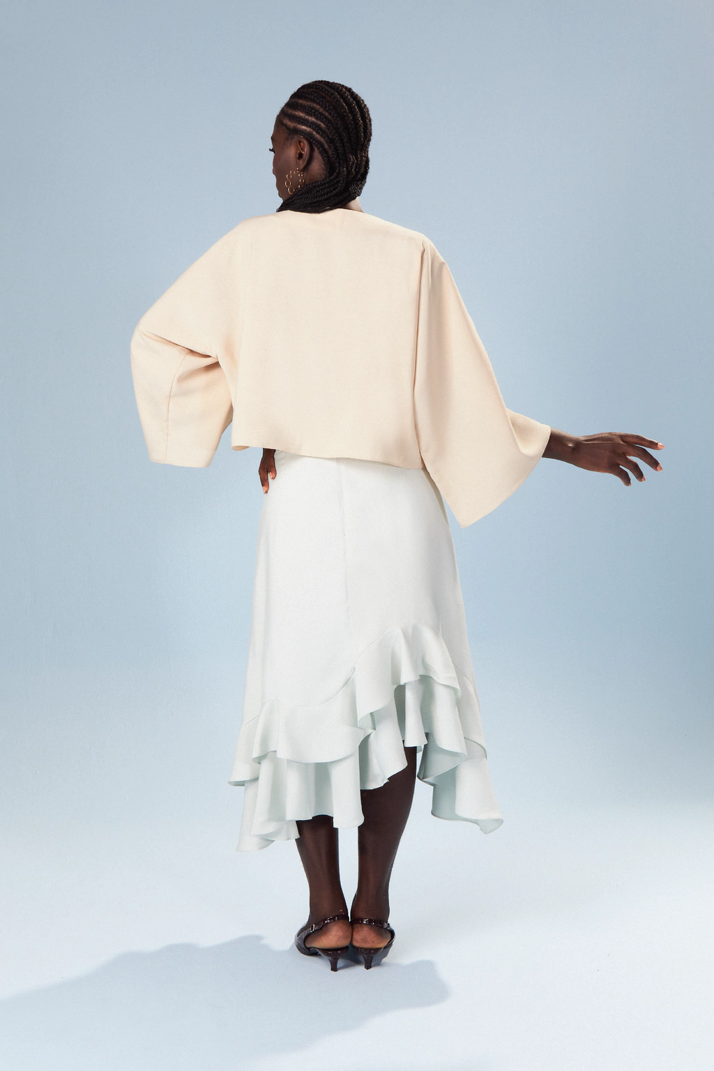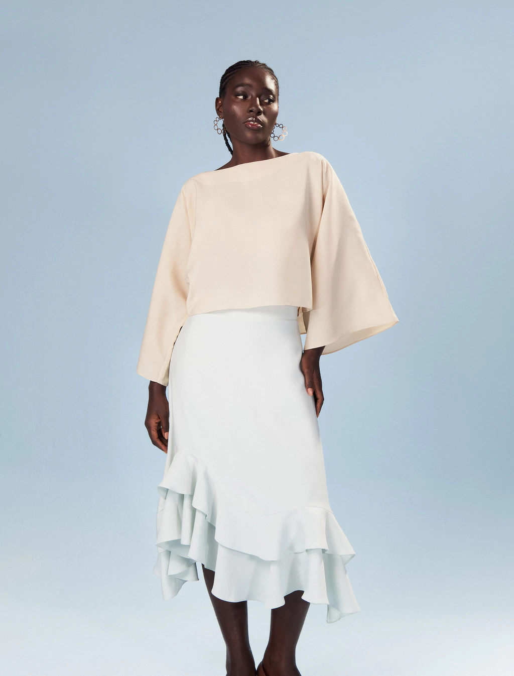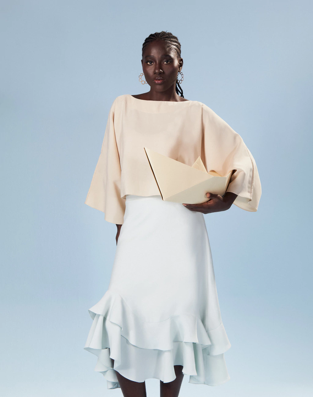 Saia Iô-iô possui modelagem evasê e comprimento midi com babados na barra. O efeito da saia acontece por ter duas camadas de babado, dando maior ênfase no seu desenho. Apresenta zíper invisível nas costas, pences e cós que acintura melhor a peça ao corpo.