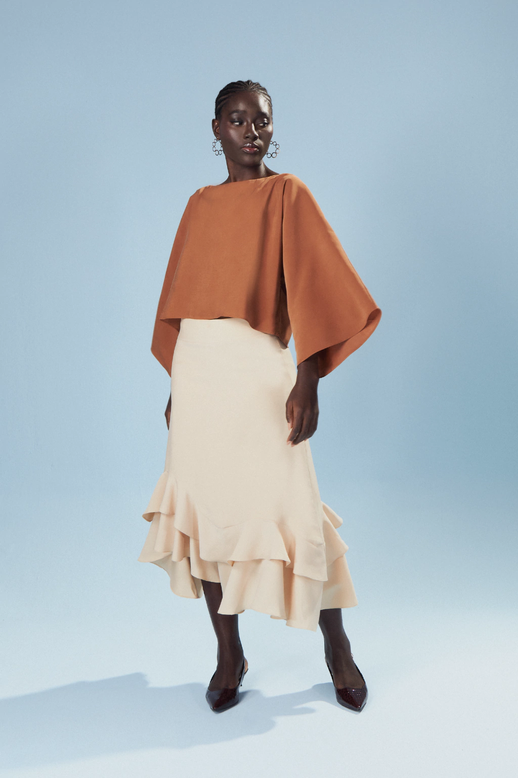 Saia Iô-iô possui modelagem evasê e comprimento midi com babados na barra. O efeito da saia acontece por ter duas camadas de babado, dando maior ênfase no seu desenho. Apresenta zíper invisível nas costas, pences e cós que acintura melhor a peça ao corpo.